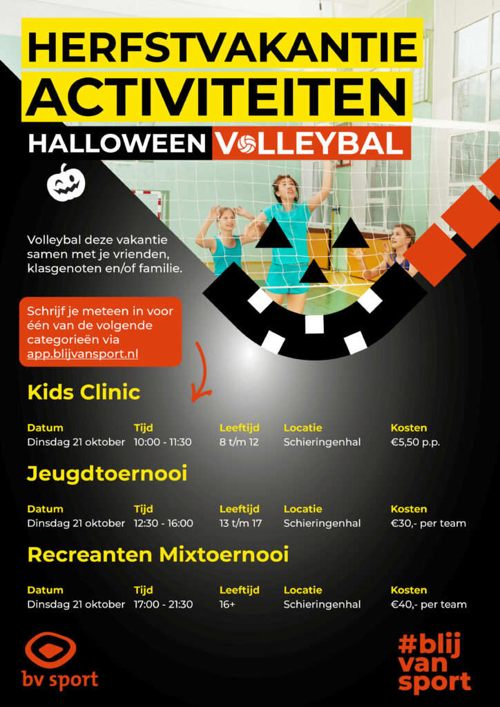Op dinsdag 21 oktober, midden in de herfstvakantie, verandert de Schieringenhal van Sportcentrum Kalverdijkje in een griezelig gezellige volleybalarena! Bv SPORT organiseert een Halloween Volleybaltoernooi voor jong en oud, fanatiekeling én recreant.